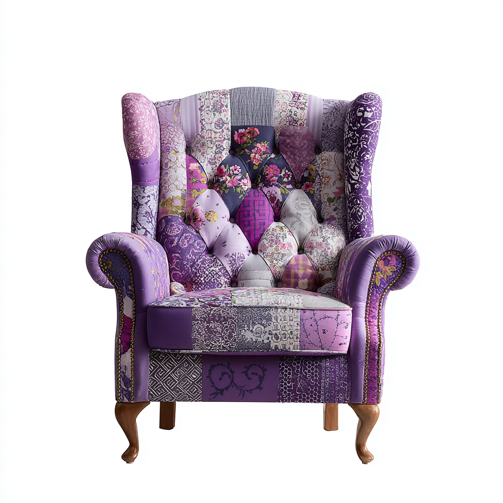 This fabric armchair features a high backrest with winged sides and a richly patterned patchwork upholstery, designed to add character and comfort to living room interiors.