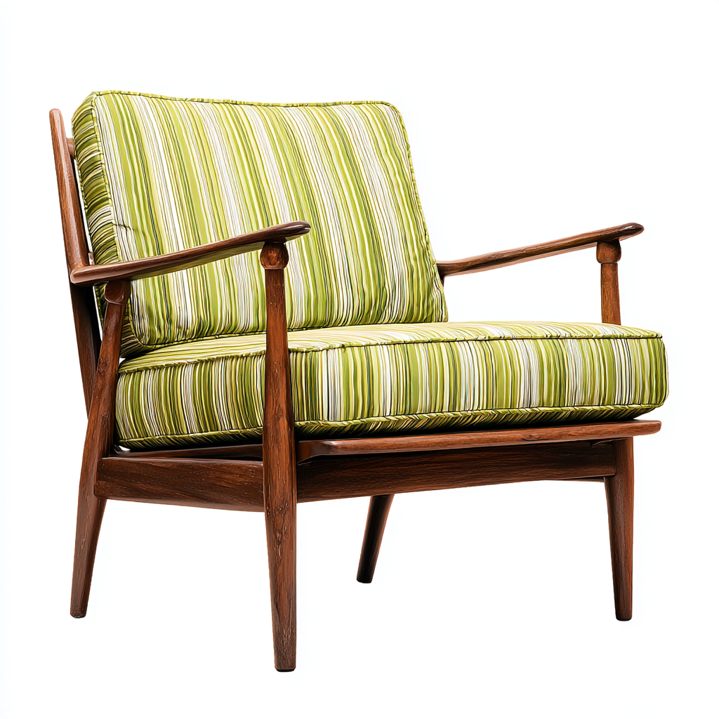 The armchair features upholstered fabric cushions in a green striped finish, offering visual texture and a soft touch. The frame and legs are crafted from solid wood with a natural finish, ensuring structural stability and long-lasting durability.