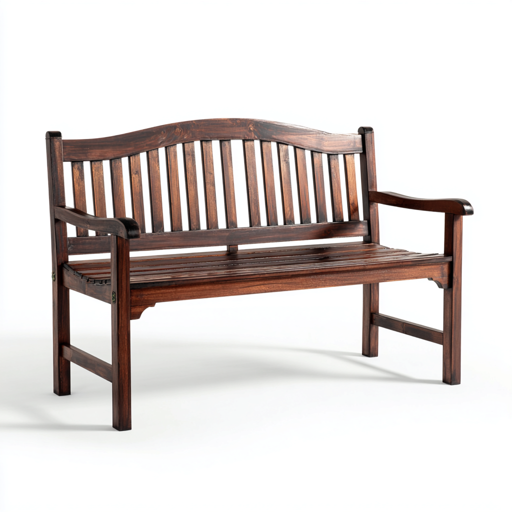 This outdoor bench features a traditional slatted backrest and solid wood construction, providing comfortable seating for gardens, patios, and outdoor pathways.