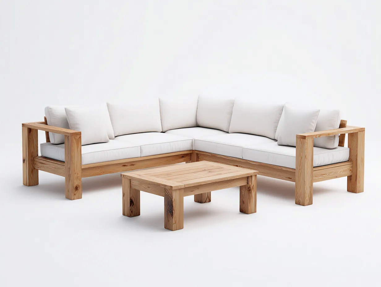 The structure is made from wood with a natural finish that highlights the grain and durability of the material. The cushions are upholstered in white fabric, creating a clean and balanced appearance suitable for outdoor environments.